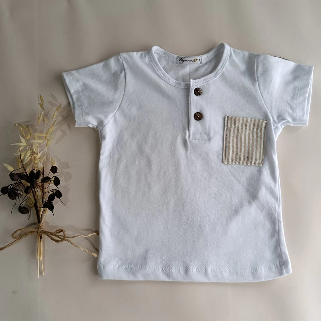 🌟 Remera bebe Botones y bolsillo rayado beige Comodidad y estilo en un solo click 🌟🥥